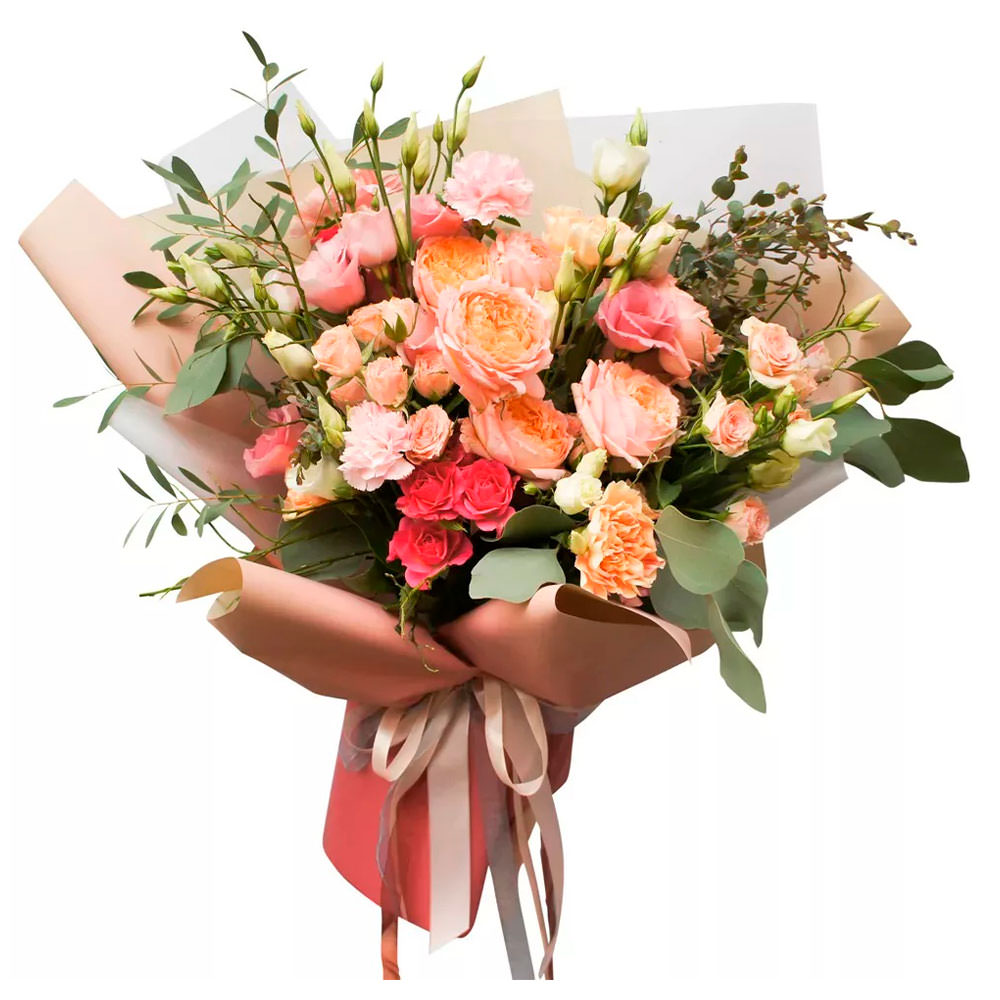 Роза кустовая пионовидная, роза кустовая, эустома, зелень.