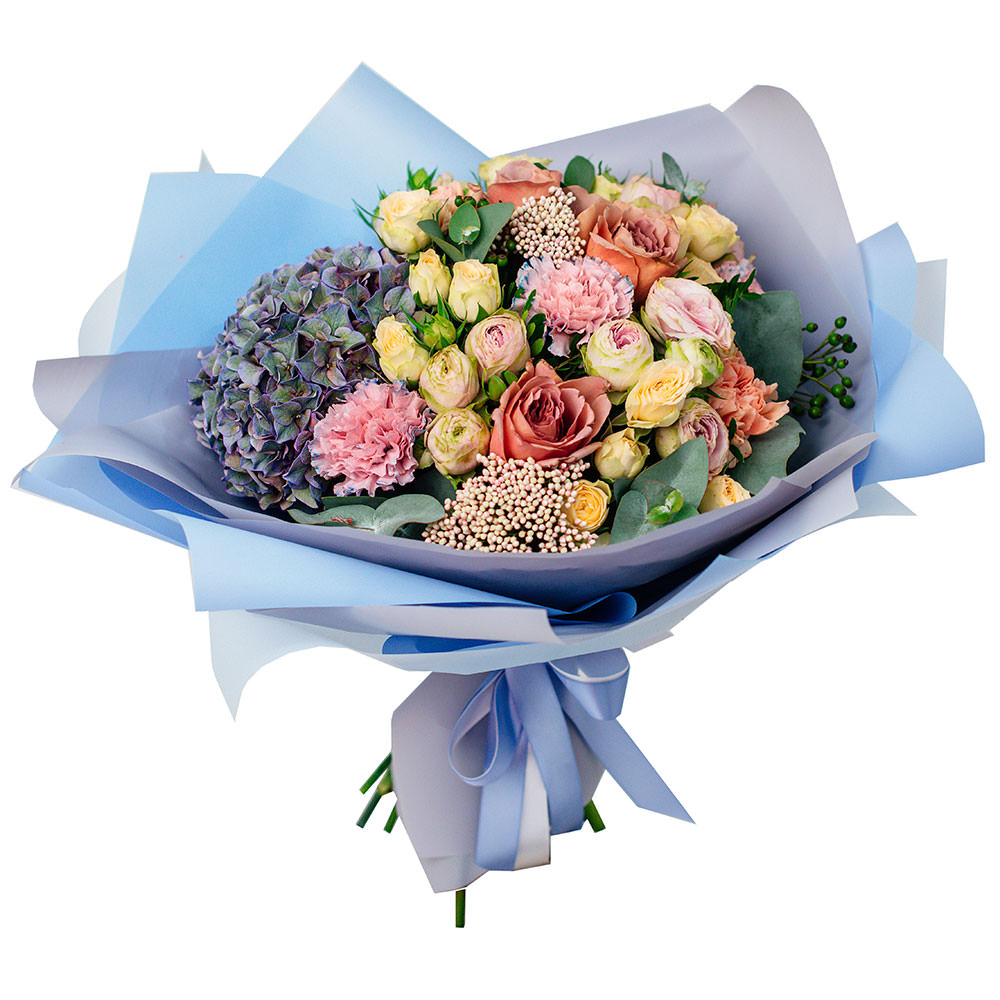 Гортензия, роза кустовая, роза одноголовая, гвоздика, озотамнус, эвкалипт.