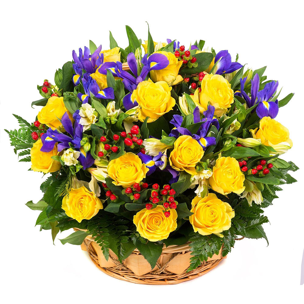 Роза желтая, ирис, альстромерия, гиперикум, зелень.